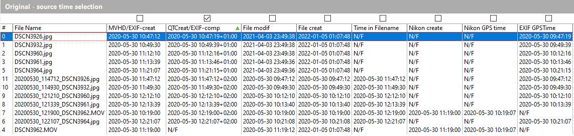 Two columns show external data from the filesystem: creation and modification. In some cases one of these could be useful as ‘source time’. One other method is using data included in the filename. I once digitized many DV tapes and stored the files named like: YYYYMMDD_HHMMSS_~~.mp4. In that case the column ‘Time in Filename’ can be used as source time.