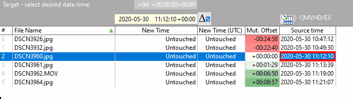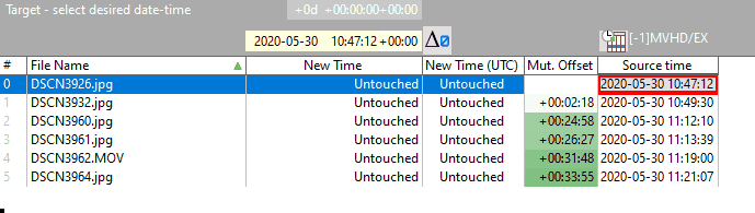 With the check boxes above the columns in the Original-panel the source time can be selected; this is reflected in the Source time column of the Target-panel.